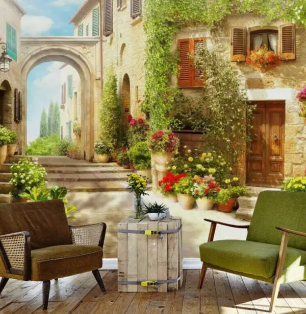 £14.25£7.84Wall murals Stone building with a door and a doorway with plants in pots