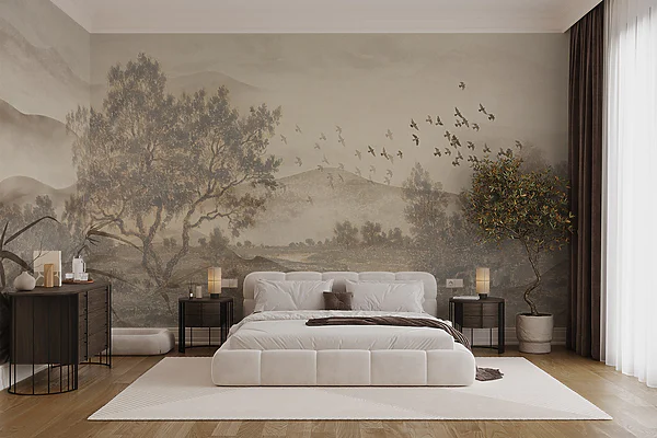 For a touch of romance and mystique, nothing beats a forest in the fog mural. I’ve seen this transform a minimalist bedroom into an ethereal retreat, creating an otherworldly ambiance.