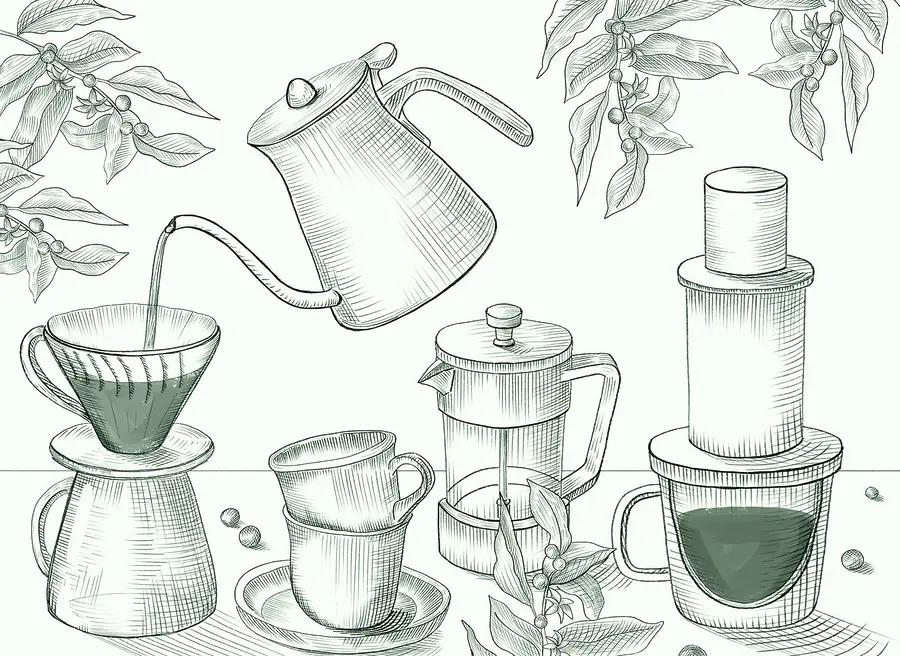 Transform any space with this delightful wall mural featuring the art of coffee brewing. Picture it—a cozy corner, your favorite armchair, and this intricate design as a backdrop. The sketchy style brings a touch of charm and whimsy, like a warm hug from your favorite barista. The detailed coffee pots and cups seem to dance with nostalgia, sparking memories of lazy mornings and coffee shop chats. It’s not just decor; it’s a conversation starter, perfect for those mornings when you need a little extra inspiration to kick-start your day. Let this mural infuse your space with flavor and personality.
