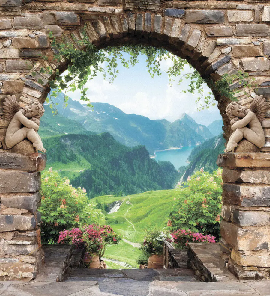 Wall murals Stone archway with stone statues and a view of a valley and mountains