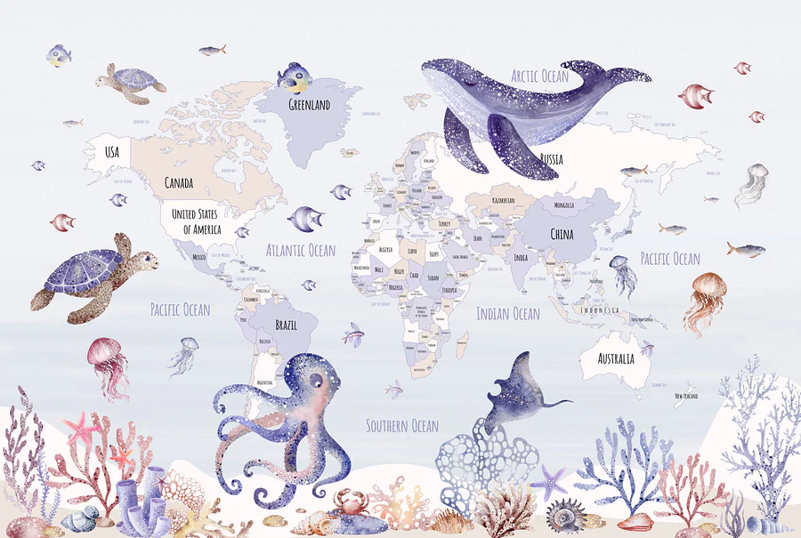 Wall murals Map of the world with sea animals