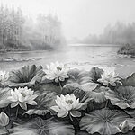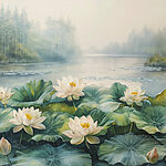 Wall murals Painting of a pond with white flowers and green leaves